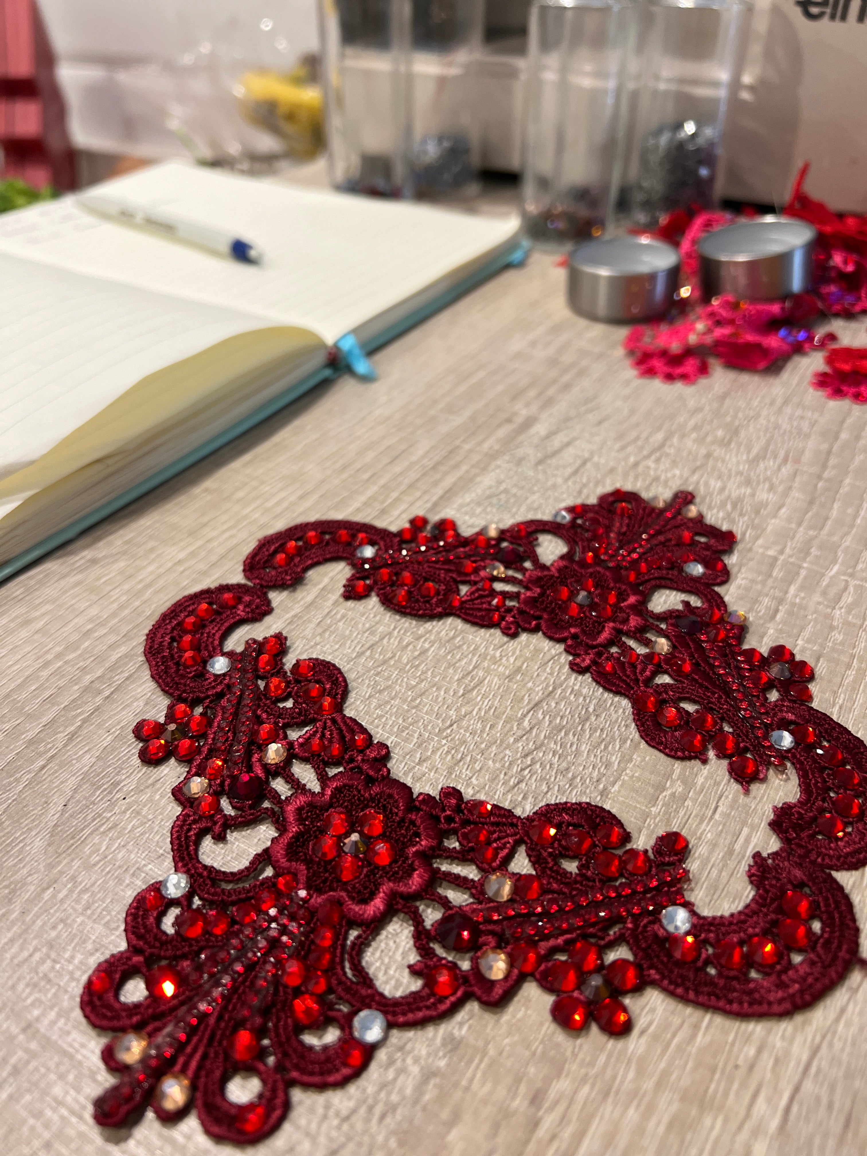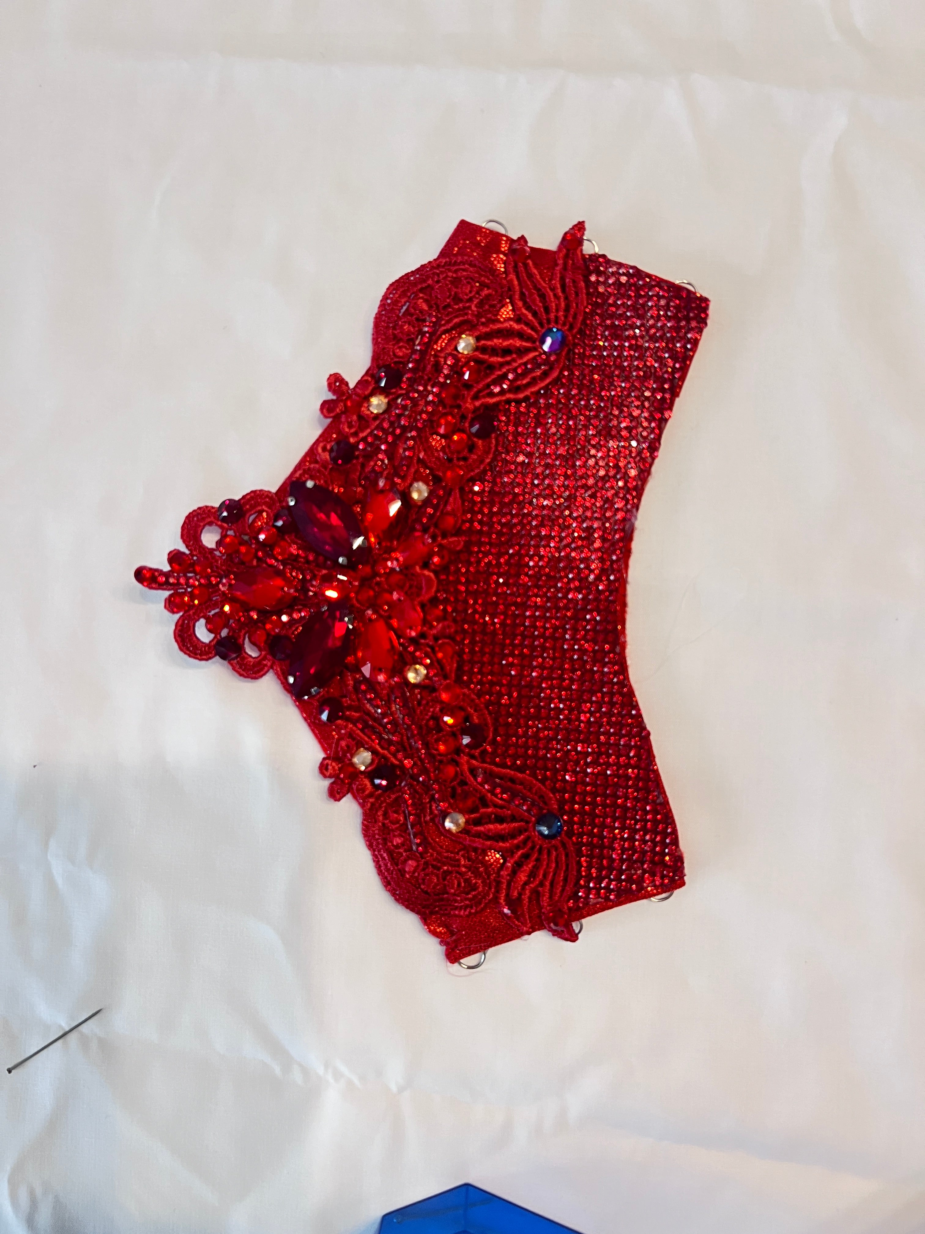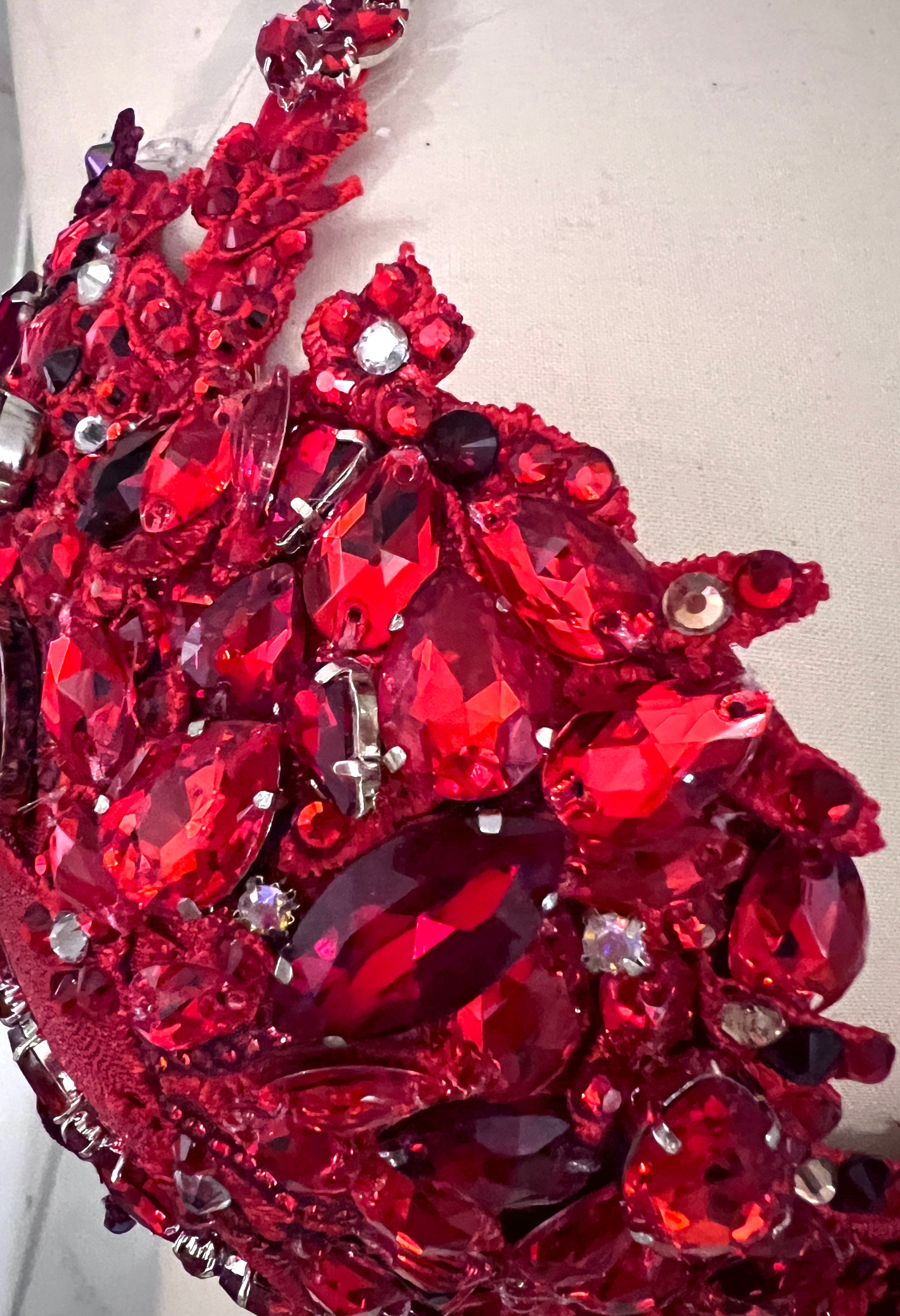 For this bespoke creation, we collaborated closely with Sadie Welder to bring her vision to life — a bold statement in red, dark red, and burgundy crystals that dances with depth and dimension.